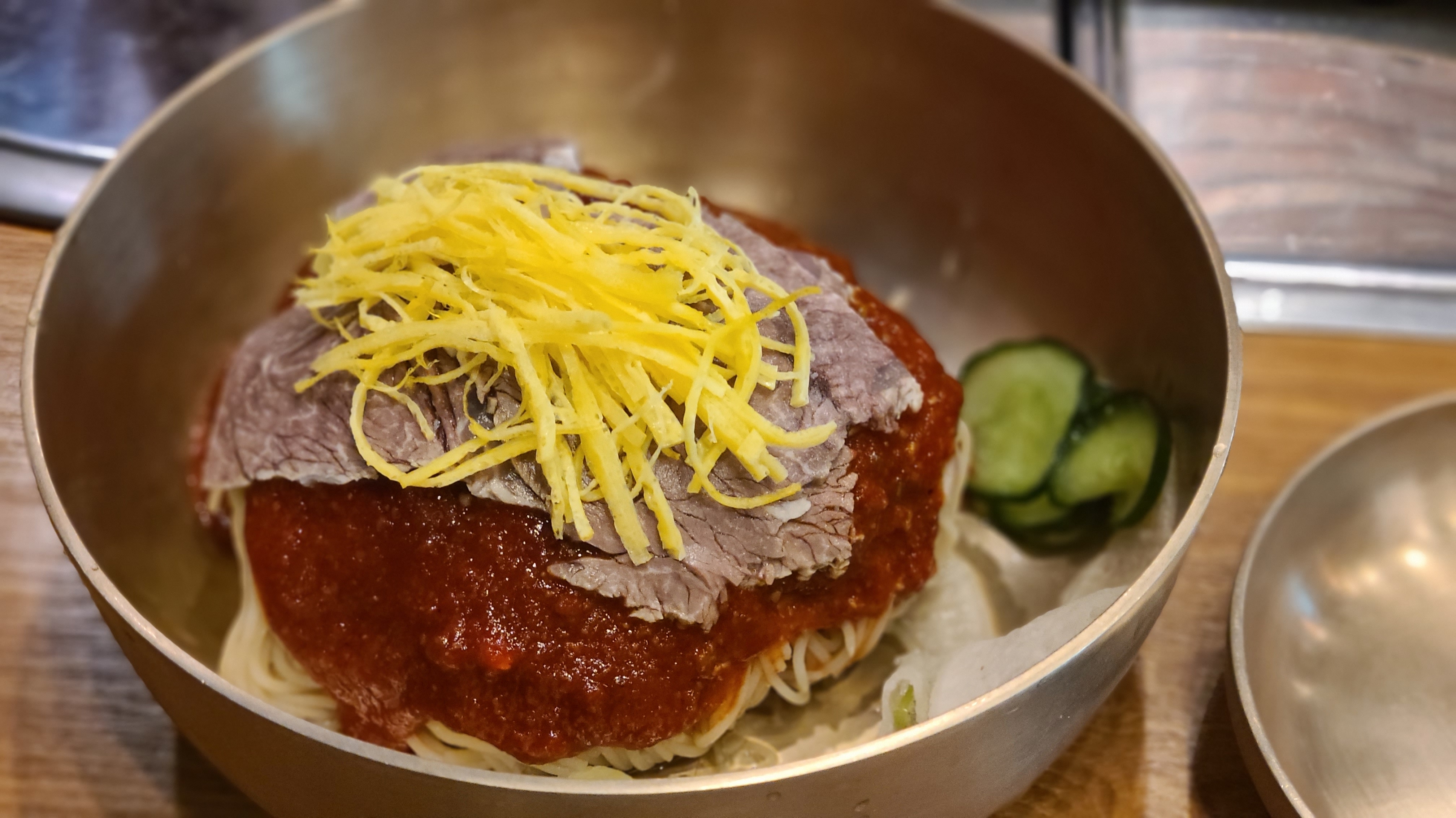 면발은 메밀 함량이 높은 회색빛을 띠며, 쫄깃보다는 부드럽고 담백한 식감이 특징입니다. 직접 제면한 면을 사용하는 것으로 알려져 있으며, 면과 육수의 조화가 매우 안정적입니다. 계란, 소고기, 무절임 등의 고명도 깔끔하게 올라가 있어 비주얼 또한 좋았습니다. 전반적으로 자극적인 맛에 익숙한 분이라면 처음엔 심심하게 느낄 수 있지만, 진짜 평양냉면의 매력을 경험하고 싶은 분들에게는 추천할 만한 곳입니다.