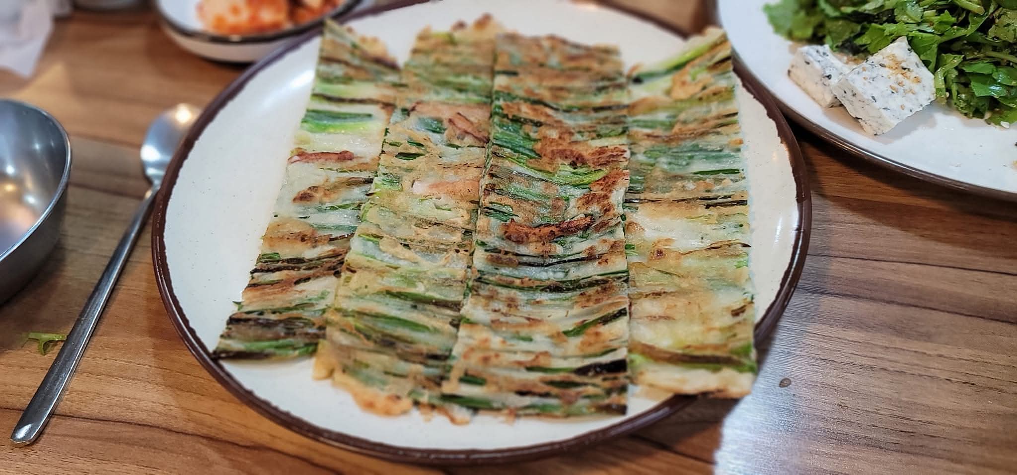 또한 바삭한 파전도 빼놓을 수 없습니다. 겉은 바삭하고 속은 촉촉하게 구워져, 술 한잔이 절로 생각나는 메뉴였습니다. 해물이 아낌없이 들어가 있어 씹을 때마다 풍미가 터져 나왔습니다. 여기에 수제 만두까지 더하면 정말 푸짐한 한상이 완성됩니다. 만두피는 얇고 속은 꽉 차 있어, 칼국수와 함께 곁들이면 든든함이 배가됩니다. 까꾸리에서 식사하면 단순히 배를 채우는 것이 아니라 집밥처럼 건강하고 정성스러운 한 끼를 맛본다는 느낌을 받을 수 있습니다.