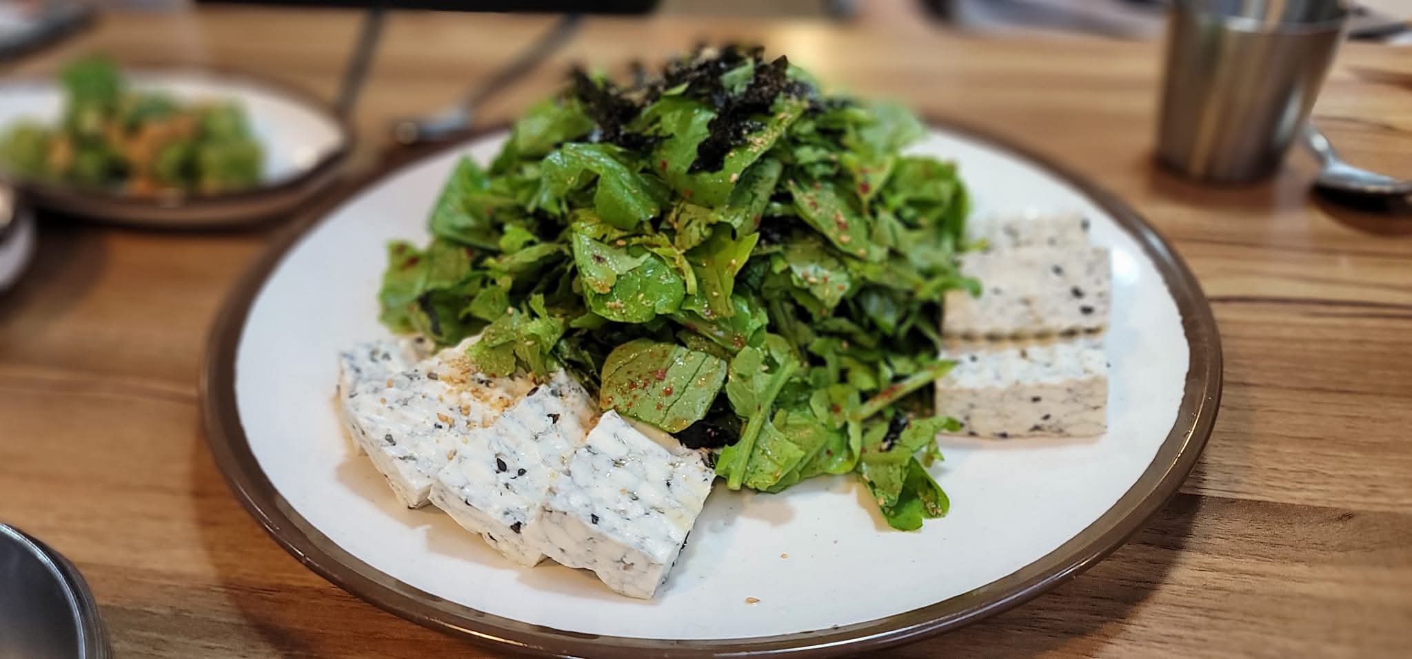 도토리묵 역시 탱탱한 식감이 살아있어 고소하면서도 깔끔하게 즐길 수 있었습니다. 흔히 볼 수 있는 메뉴 같지만, 까꾸리에서 맛본 도토리묵은 유난히 신선하고 잡맛이 없어 건강한 밥상이라는 느낌이 강했습니다. 칼국수와 함께 먹으면 느끼함을 잡아주고, 별도로 즐겨도 충분히 만족스러운 메뉴라 웰빙 콘셉트와 잘 어울렸습니다. 이러한 메뉴 구성이 단순한 식사가 아니라 건강을 챙기는 즐거운 경험으로 이어진다는 점이 이곳의 큰 장점이었습니다.