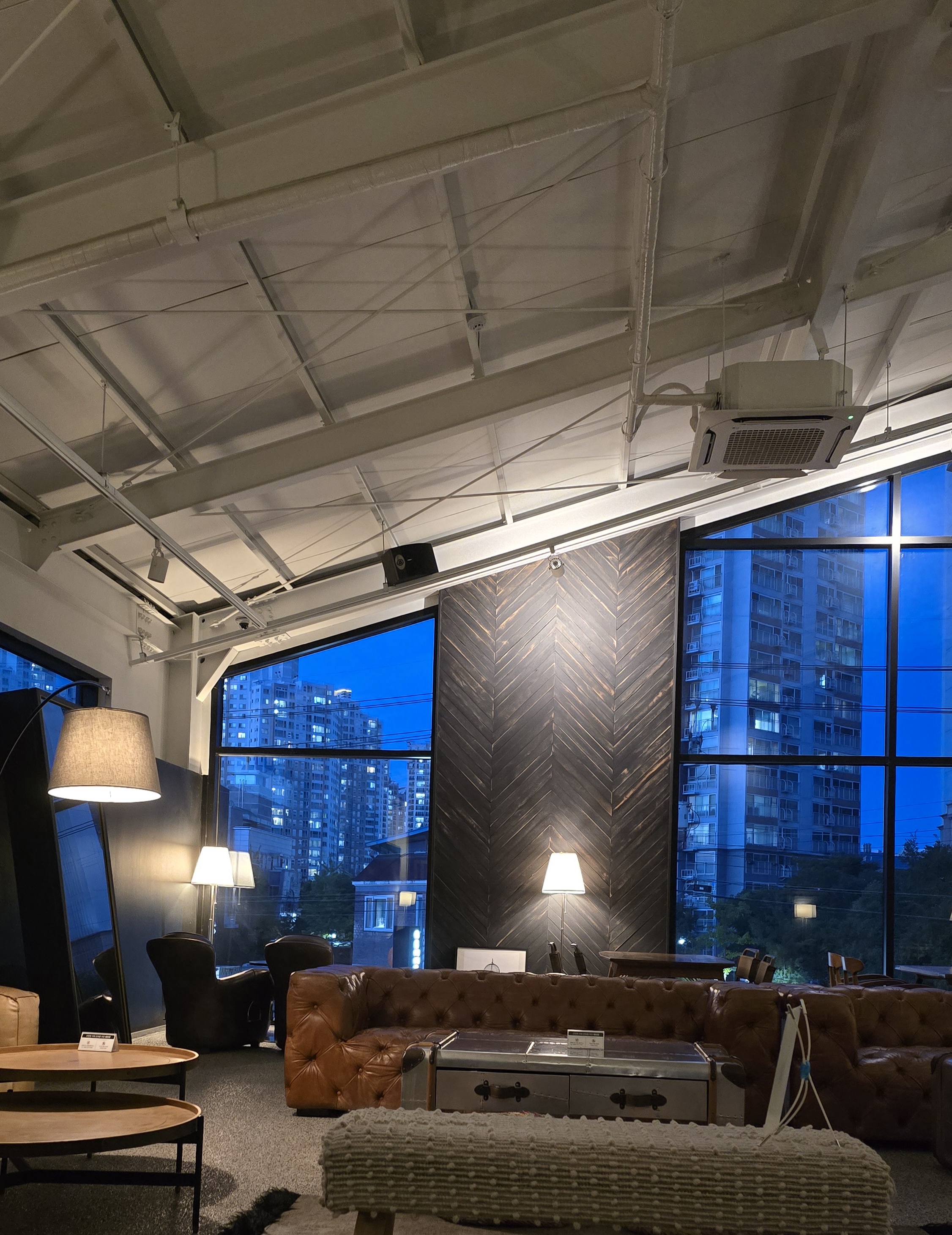 전체적으로 우드톤의 따뜻한 색감이 주를 이루며, 커다란 창을 통해 자연광이 가득 들어와요.