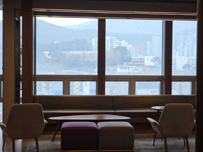 6층에 있는 로비인데 엘베에서 내리면 바로 보이는 해리단길 뷰입니다