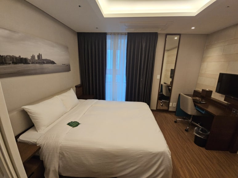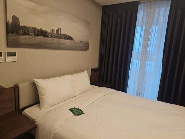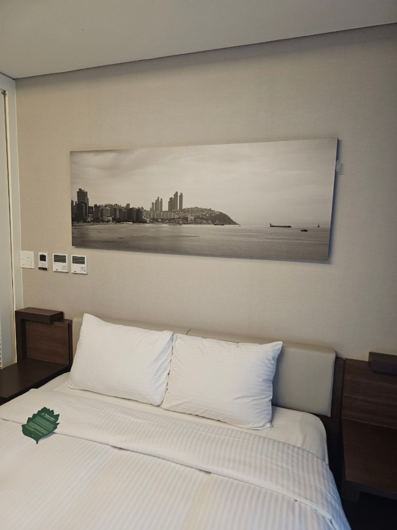 침대 머리맡에 사진.. 흑백 사진이라 너무 인상적이었어요. 해운대를 한눈에 담을 수 있었어요