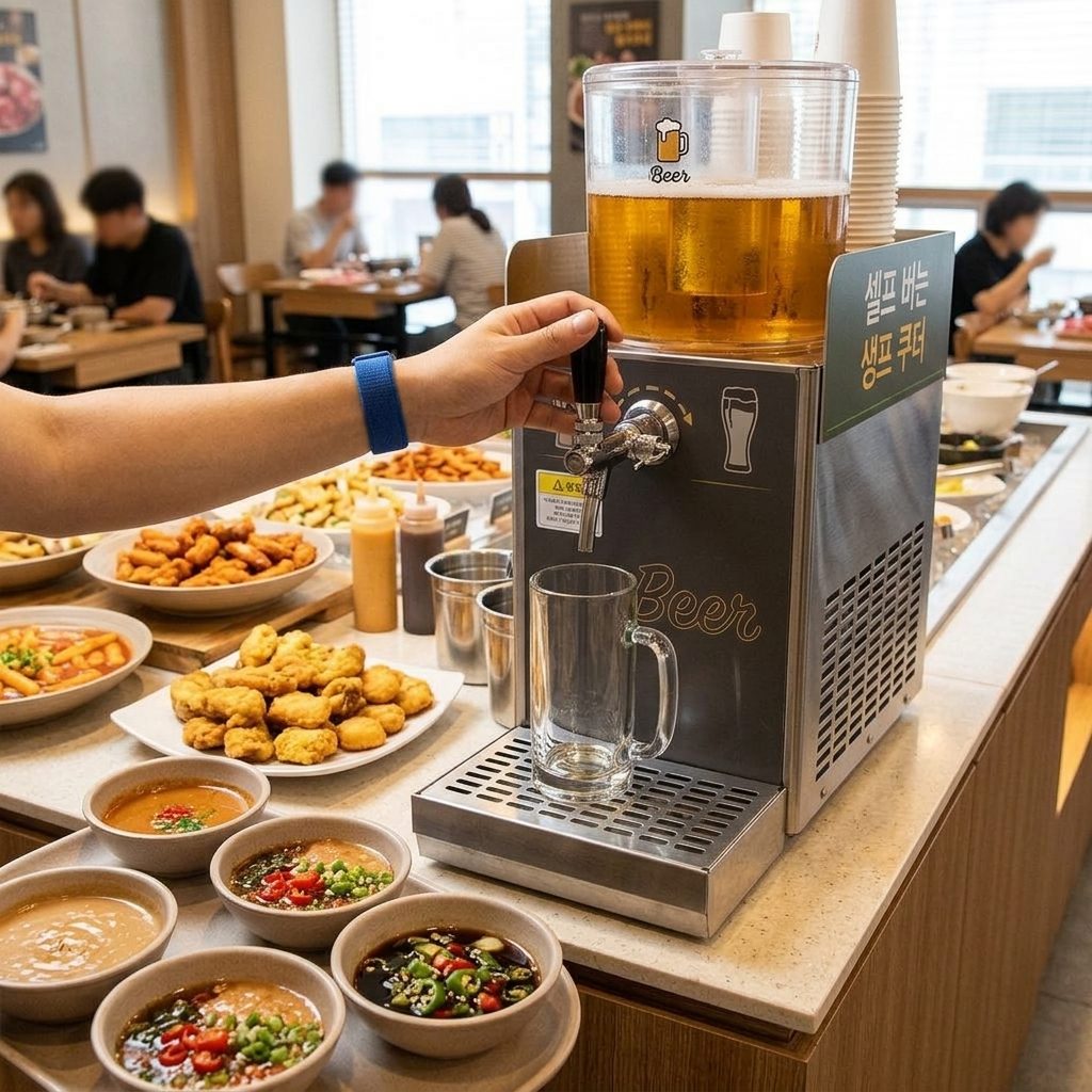 샤브올데이의 숨은 메인은 사실 소스바 같았어요. 기본 소스만 해도 7가지가 준비돼 있고, 요즘 유행하는 땅콩·칠리·고추기름 섞는 조합을 바로 따라 해봤습니다. 땅콩소스 2, 칠리 2, 고추기름 살짝 넣어서 섞으니 고기 찍어 먹을 때 진짜 잘 어울리더라고요. 맵찔이도 먹을 수 있을 정도의 적당한 얼얼함이었어요. 사이드 중에서는 미나리 삼겹살이 제일 인상적이었는데, 훈제 느낌이 아니라 기본 삼겹살에 미나리 향이 은은하게 올라와서, 곤드레밥이랑 비벼 먹으니까 완전 별도 메뉴 같았습니다. 한 가지 아쉬웠던 건 콜라보 파스타였어요. 소스 맛은 괜찮은데 면이 살짝 불어 있어서 한두 입만 먹고 다시는 안 가져오게 되더라고요. 반대로 맥주 무제한은 만족도가 높았어요. 입장할 때 파란 팔찌를 받으면 셀프 기계에서 마음껏 따라마실 수 있는데, 샤브샤브 특유의 뜨거운 국물 사이사이에 시원한 맥주 한 잔씩 마셔주니 100분이 정말 금방 지나갔습니다.