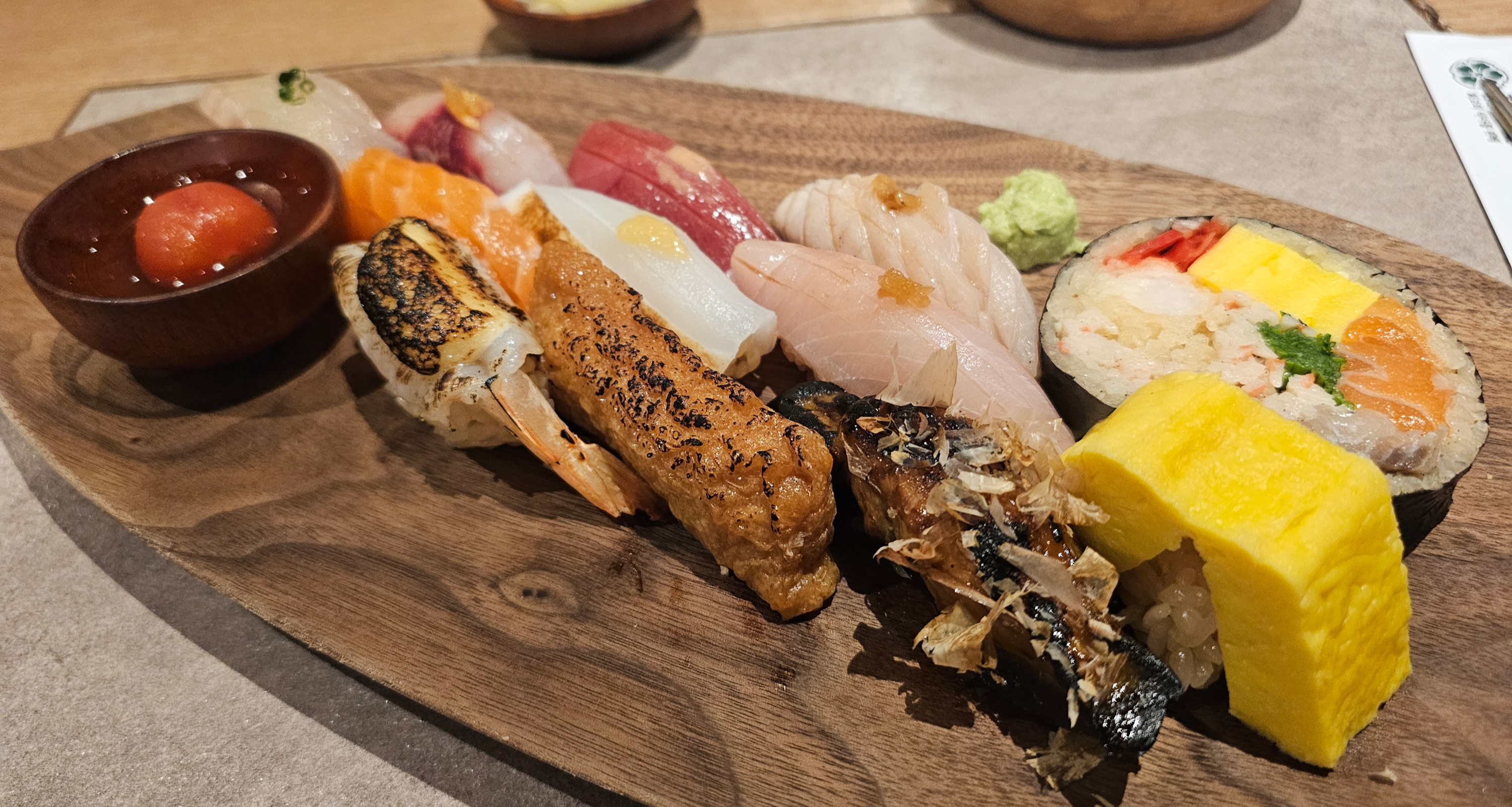 세트 메뉴를 주문하면 기본 초밥 외에도 계란말이, 간장새우, 전복, 타코와사비 등 다양한 구성의 메뉴가 함께 제공되어 가격 대비