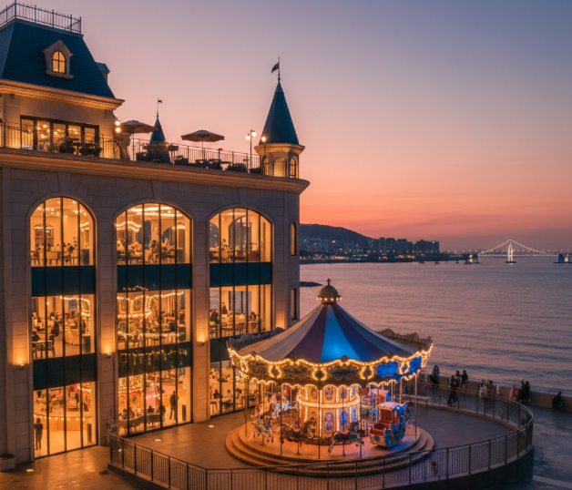 영일대 해수욕장의 새로운 랜드마크로 떠오른 오브레멘은 카페 내부에 실제 작동하는 거대한 회전목마가 있는 것으로 유명합니다. 회전목마는 화려한 조명과 함께 인생샷을 남기기에 최적의 장소입니다.