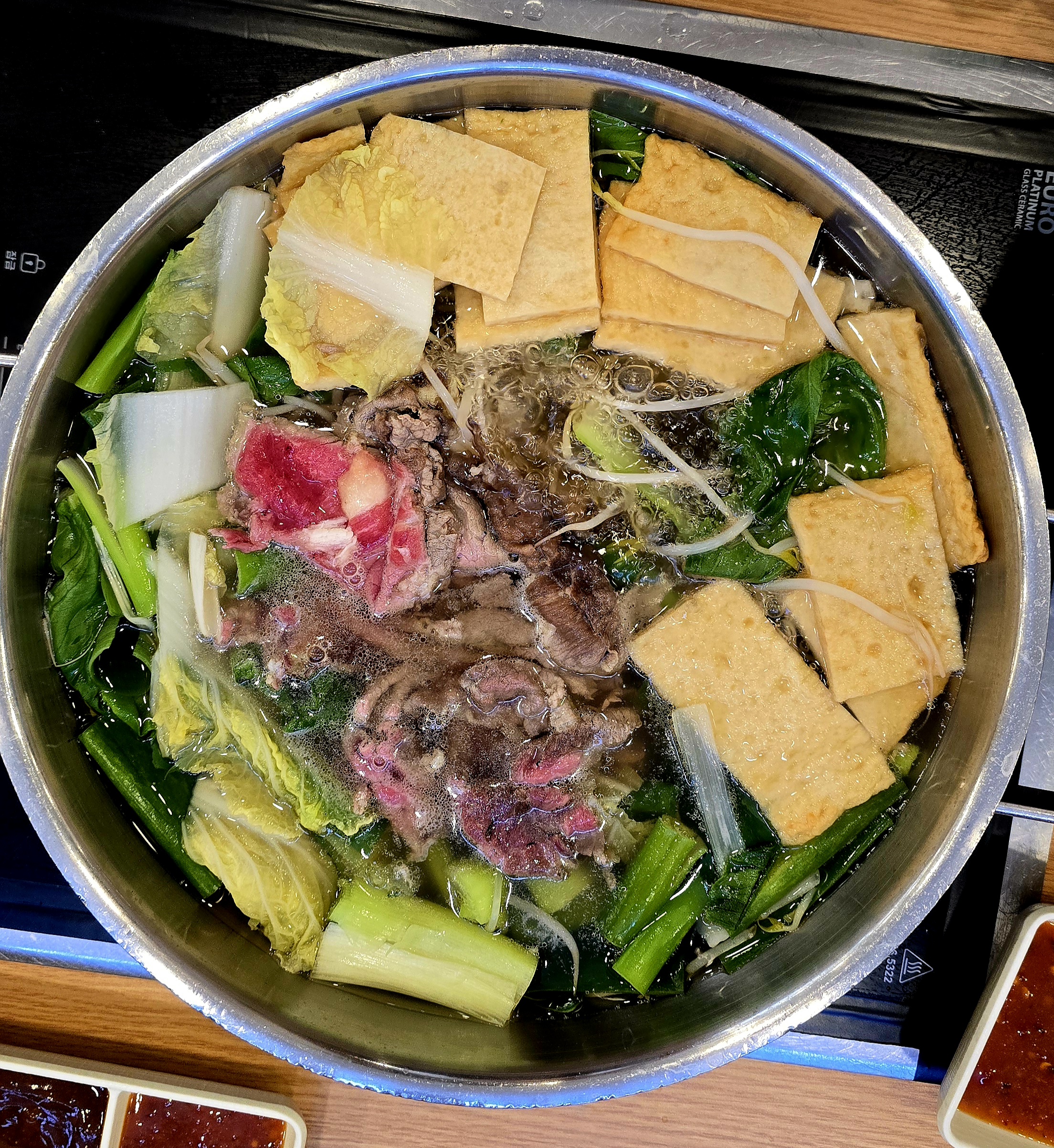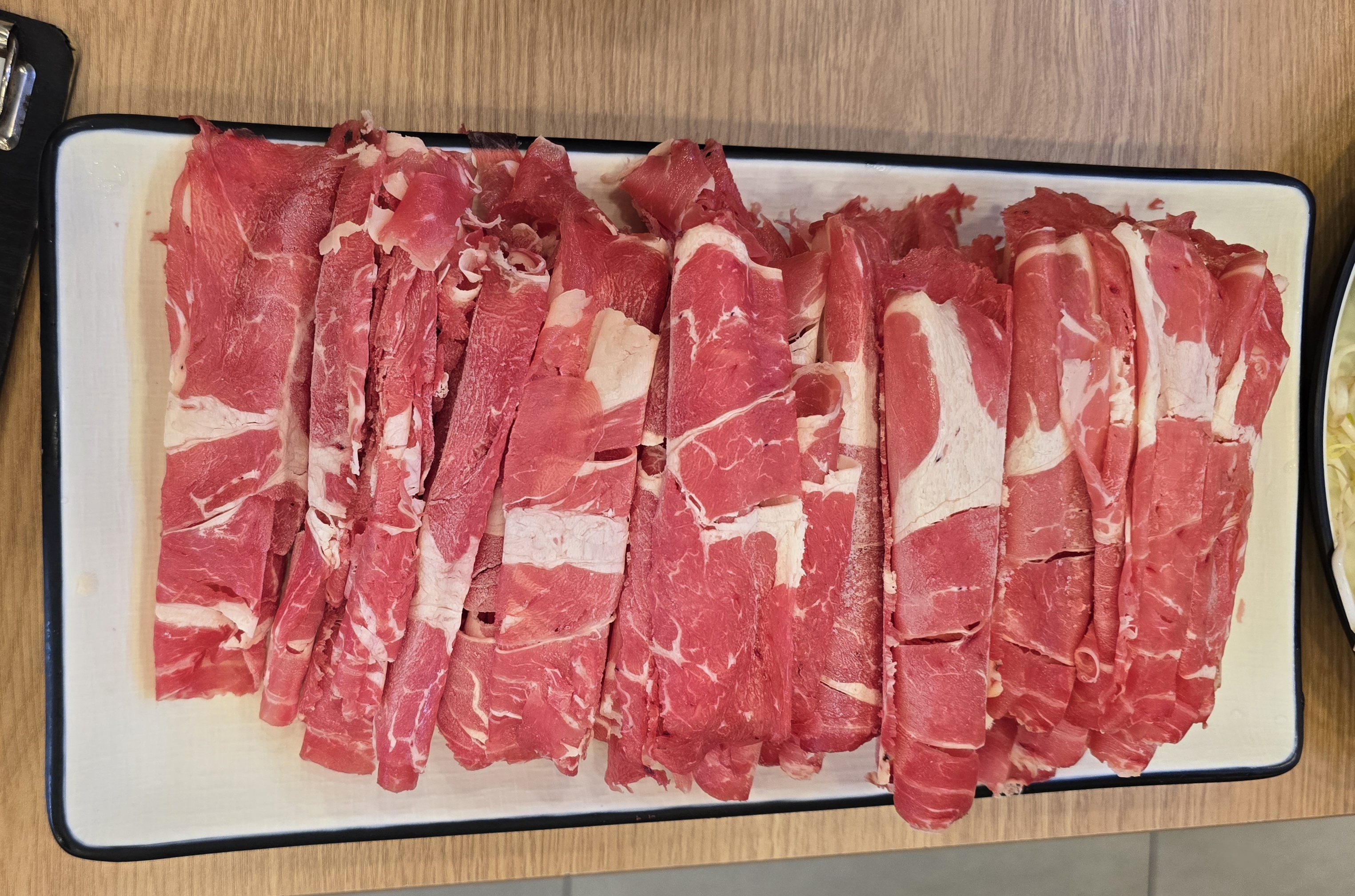 특히 고기의 질이 기대 이상이었는데요, 얇고 부드러운 소고기가 육수에 살짝 익혀져 입안에서 사르르 녹는 맛이 일품이었습니다. 채소는 깔끔하게 손질되어 있고, 무제한 리필 코너도 운영하고 있어 푸짐하게 드실 수 있어요.