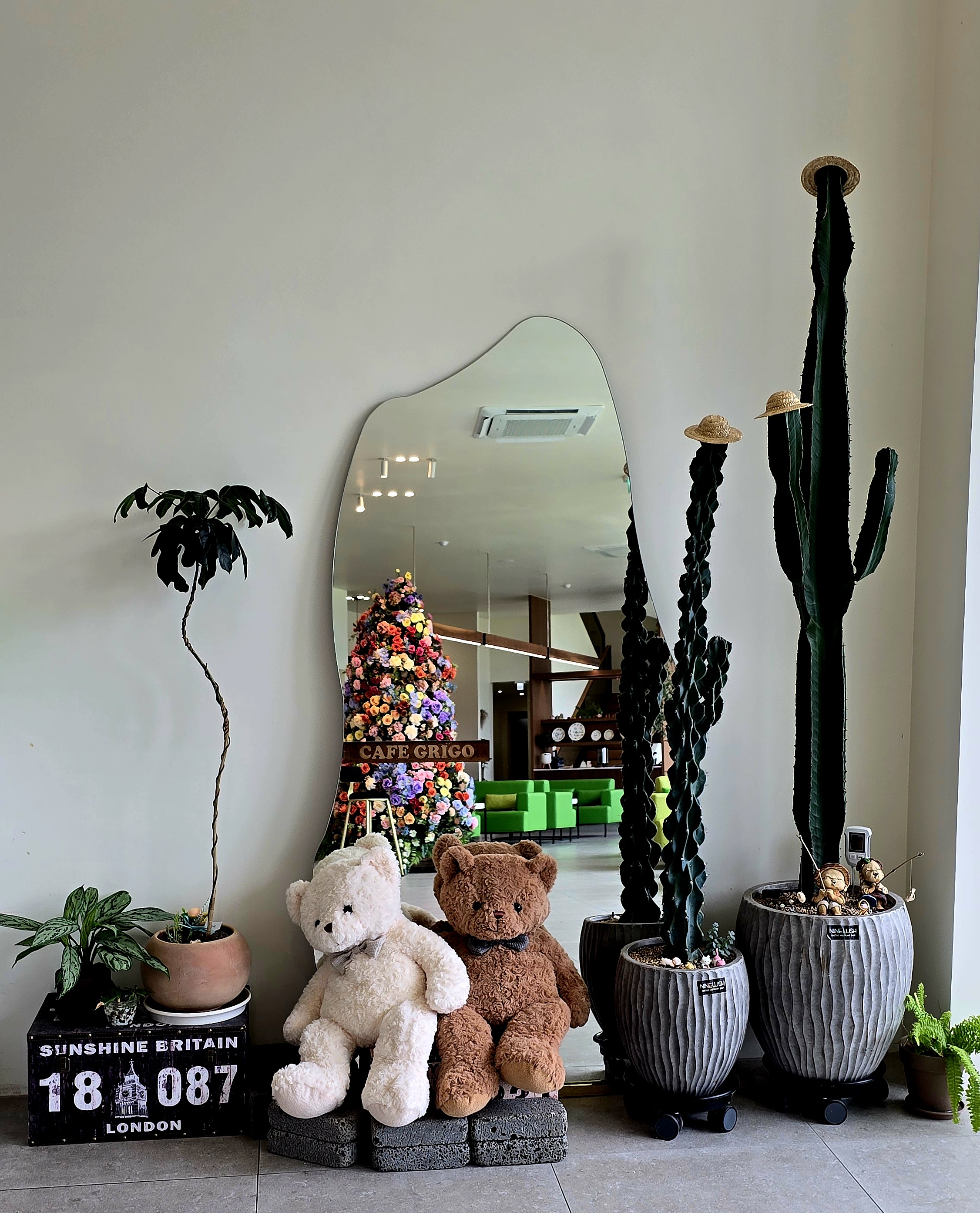카페 내부의 멋진 인테리어와 식물들이 조화를 이루고 있어 자연과 도심 감성을 동시에 느낄 수 있습니다.